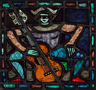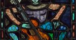 Harlekin mit Gitarre | H x B 53 x 53 | GLM, bleiverglast, geätzt, SLM, Emailfarbe